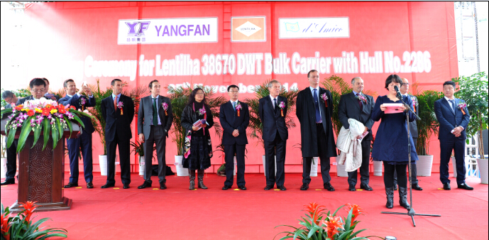 A naming ceremony was held for the 38670DWT bulk carrier H2286 which built by Zhoushan Shipyard on November 25. Patrice de Carmaret. The Chairman of Dora Investimentos Ltd, the Sponsor Ms. Zhang Lijia and Li Mingdong,the chairman of Yanfan group attended the ceremony.